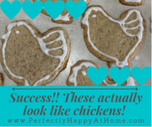 The cookies I was thinking of were from a cookie recipe I had found the night before while sifting through Joanna Gaines’ second Magnolia Table cookbook. By the way, I love and own BOTH of those books, and the first one is awesome, too. This particular recipe is for round cookies and this morning, thanks to the chickens, I envisioned chicken-shaped cookies. Lucky for me, I have a chicken-shaped cookie cutter already! Anyways, the recipe is called “Crew’s Cookies,” and they have icing on them. Sounds simple, right? Well, I have this knack for complicating…errrr…customizing things. Here is what it looked like at our house today: