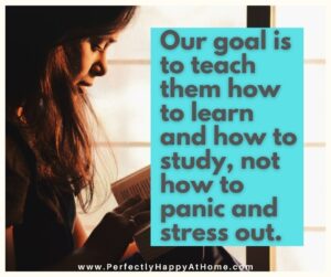 As they moved through middle school, I began to teach testing and quizzing techniques for subjects other than spelling. We still called them tests and quizzes, and corrected them as such, but no letter grade was assigned. This was for the purpose of learning how to study and learning how to take tests without the blow of an undesired letter grade staring them in the face. They were able to discern what study methods worked well for them, and which ones didn’t. Tests were able to be repeated in order to better master study skills without penalty. This also facilitated a less-pressured way to learn the proper way to study for and take a test without the added stress of trying to earn a certain letter at the same time. This helped a lot, too.