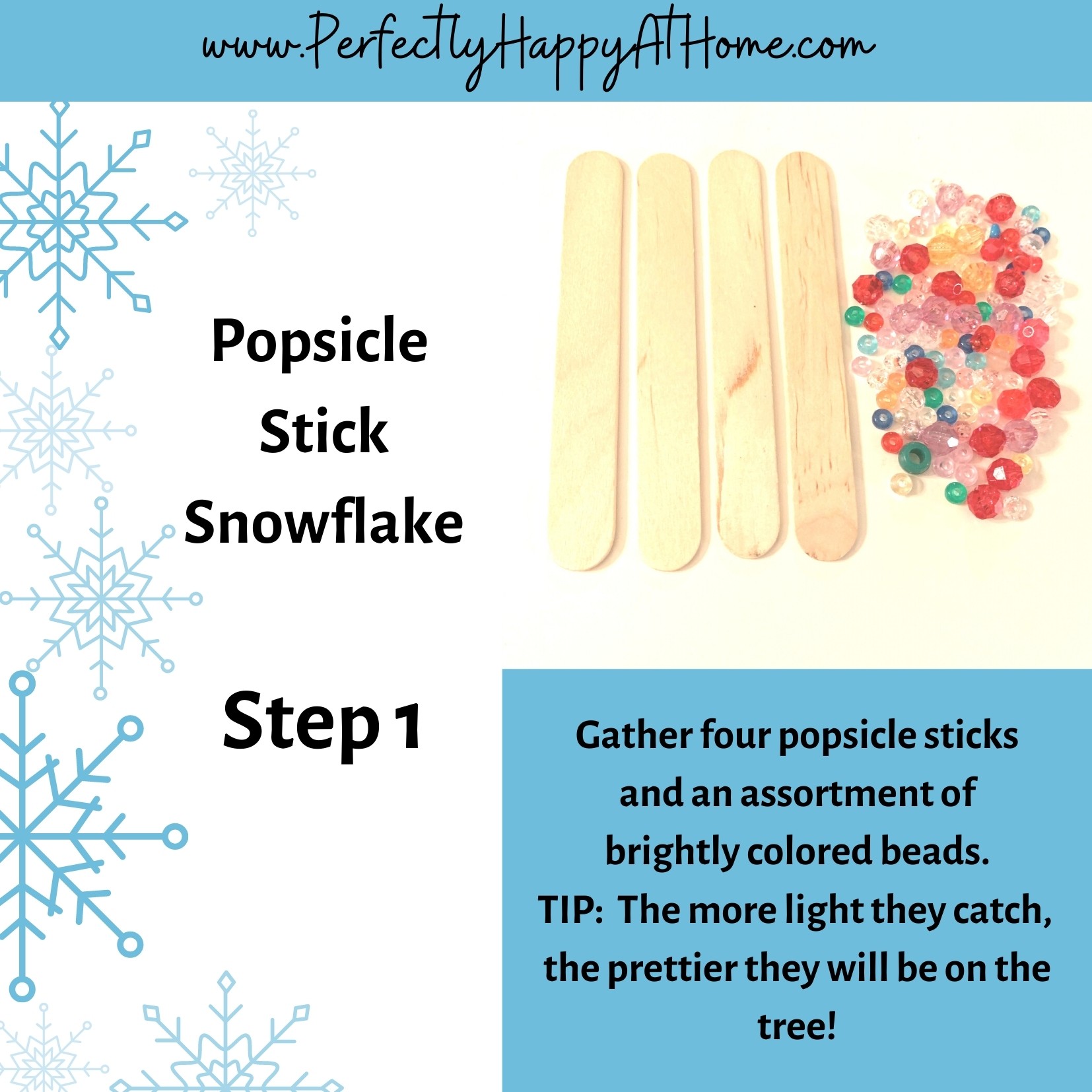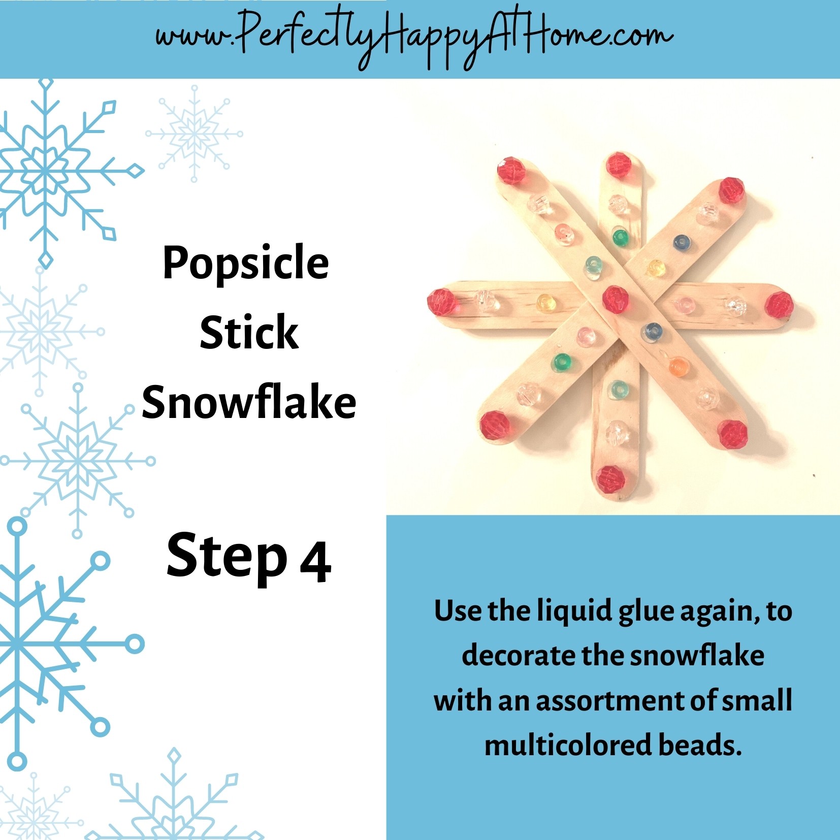 Not only are these snowflakes beautiful, but there are infinite educational and developmental benefits as well. This project requires very fine motor skills. Picking up beads is a very common exercise for developing the hand, wrist, and forearm muscles needed for all fine motor skill tasks. The hand-eye coordination and proprioception used when placing the beads into the glue drops on the popsicle sticks is a secondary element that gets practiced in this project. Additionally, kids can practice pattern skills, color matching, and shape identification of the beads.
